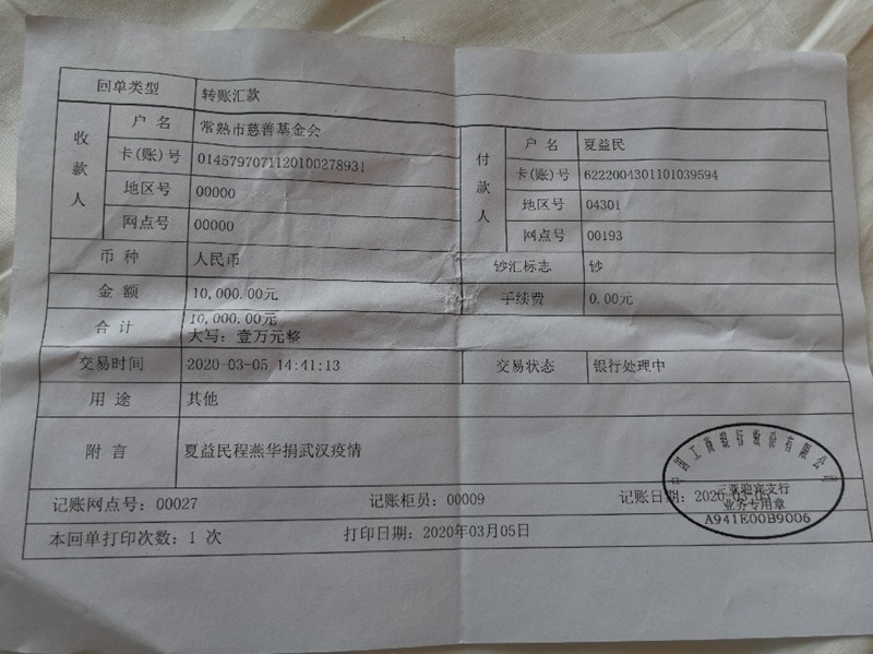 新冠肺炎疫情牵动人心,我院退休职工共产党员程燕华也一直关注疫情,她和老伴商量后,以夫妇两人的名义向常熟市慈善基金会定向捐款一万元,用于援助武汉疫情。