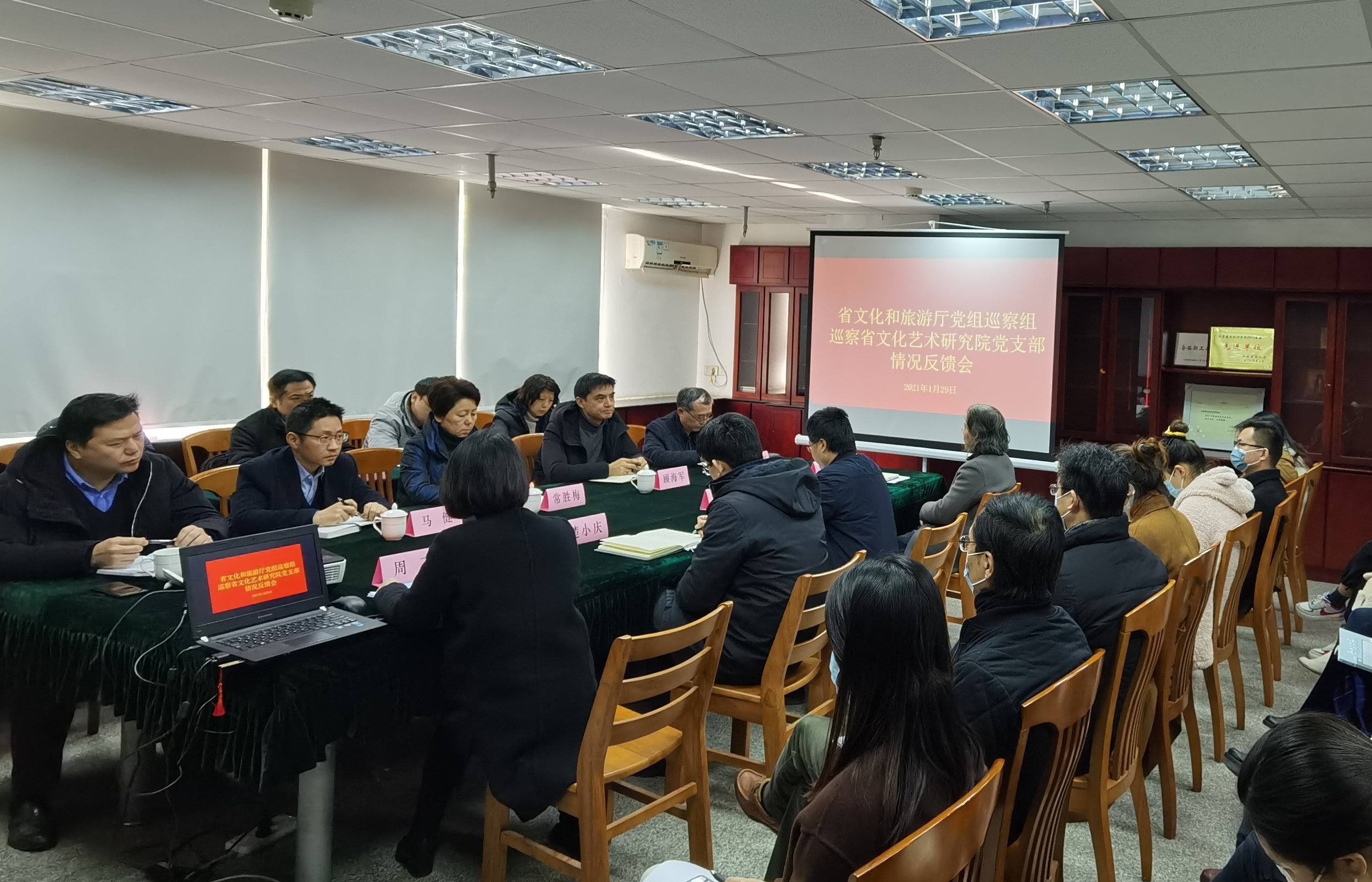 根据省文化和旅游厅党组巡察工作领导小组的安排,2021年1月29日,厅党组巡察组向省文化艺术研究院党支部反馈巡察情况。厅党组成员、副厅长、厅党组巡察工作领导小组副组长常胜梅出席会议并讲话,王占怀组长代表厅党组巡察组向院党支部进行了巡察意见反馈,院党支部书记、院长张超主持会议并作表态发言。