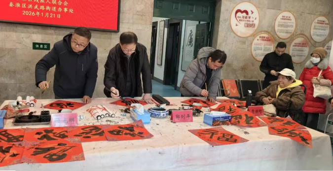 2026年1月21日上午,由江苏省文化艺术研究院、秦淮区残疾人联合会、秦淮区洪武路街道办事处共同举办的“翰墨飘香送祝福” 迎新春送福活动在秦淮区残联一楼大厅举行,为残疾人朋友送上新春的祝福。
