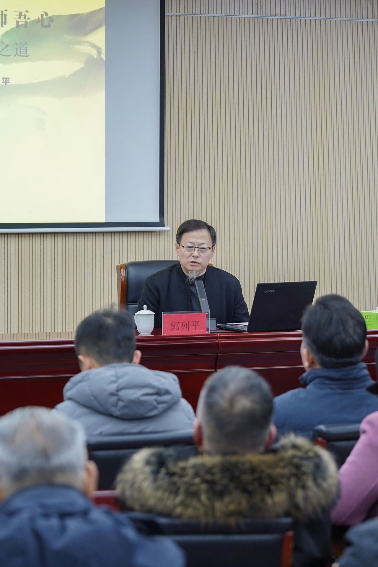 郭列平副院长以中国书法史为脉络,结合历代名家经典,讲解了字体演变顺序及用笔、用墨、结构、章法等核心技法,重点围绕书法的守正创新展开论述,进一步阐释了“师古法、师造化、师吾心”的深层内涵与内在关联。